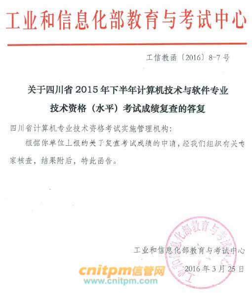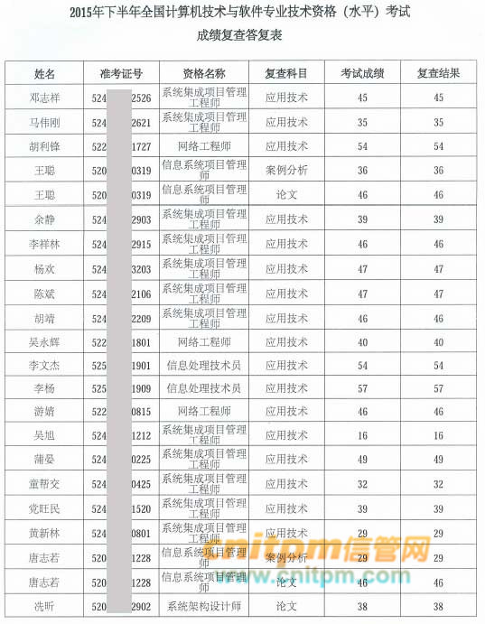四川省2015年下半年计算机技术与软件专业技术资格(水平)考试成绩复查结果已出来,经过工业和信息化部教育考试中心组织有关专家核查,提交成绩复查的考生成绩没有错误,具体结果如下: