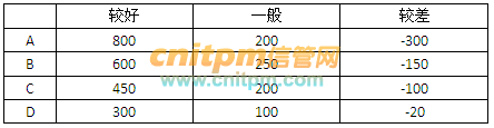 67、某企业要投产一种新产品,生产方案有四个:A新建全自动生产线;B新建半自动生产线;C购置旧生产设备;D外包加工生产。未来该产品的销售前景估计为较好、一般和较差三种,不同情况下该产品的收益值如下:(单位:百万元)