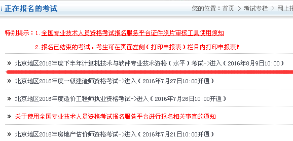 1、点击上面报名入口网址进入报名页面,注意不要使用chrome浏览器,进入后点击“北京地区2016年度下半年计算机技术与软件专业技术资格(水平)考试->进入(2016年8月9日10:00)”