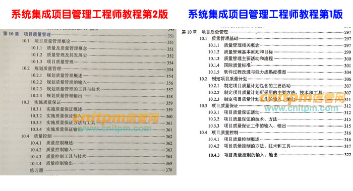 系统集成项目管理工程师第2版第10章与老版教材对比,章节修改不是很大,基本是以质量管理过程作为章节,只是章节名称上进行了修改,原先制定项目质量计划修改为规划质量管理;项目质量保证修改为实施质量保证;但是里面内容有一定修改。