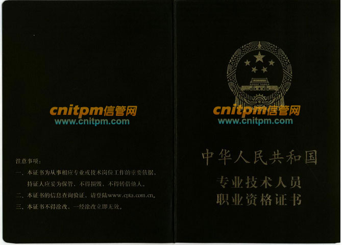 最新版信息系统项目管理师证书封面(2017年职业资格证书改版后的证书):