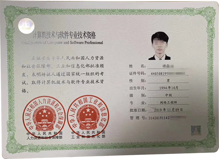 网络工程师考试合格的考生将颁发由中华人民共和国人力资源和社会保障部、工业和信息化部用印的计算机技术与软件专业技术资格(水平)证书,证书不需要注册,长久有效!