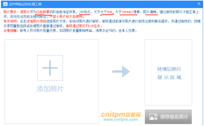考生将符合上述要求的照片通过照片验证工具进行验证,通过验证之后就算是合格照片,可直接上传至报名系统中,如未通过审核的,可按提示原因重新选择或处理照片。