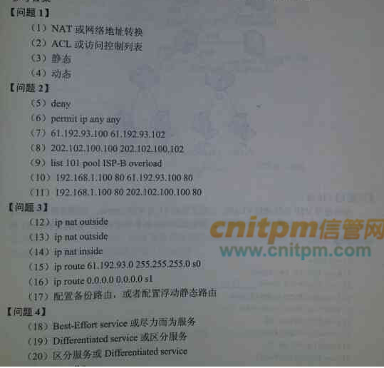 常用的网络流量控制技术除了acl(访问控制列表)外还有qos(服务质量)。qos是网络的一种安全机制,主要用来解决网络延迟和阻塞等问题,它主要有三种工作模式,分别为(18)模型、integrated service(或集成服务)模型及(19)模型,其中使用比较普遍的方式是(20)模型。