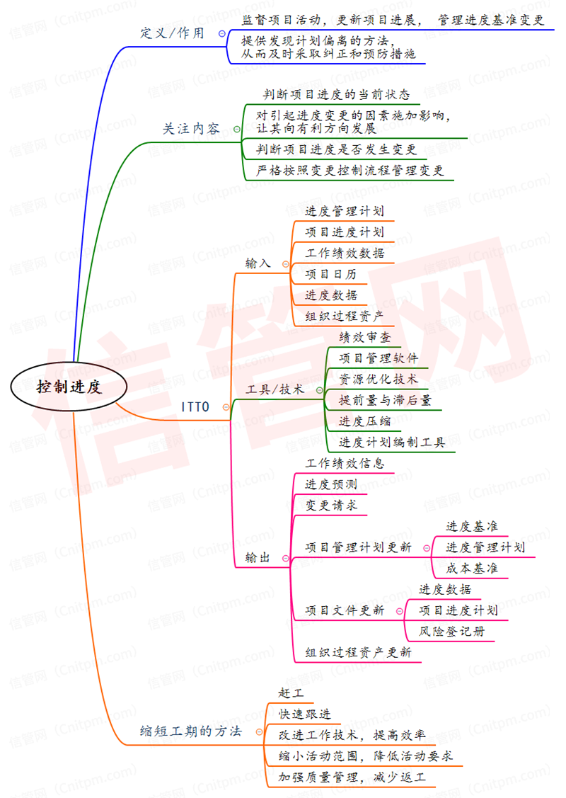 概念:监控项目活动状态,更新项目进展,管理进度基准变量,以实现计划的过程,主要作用是,提供计划偏离的方法,从而可以及时采取纠正和预防措施,以降低防线。