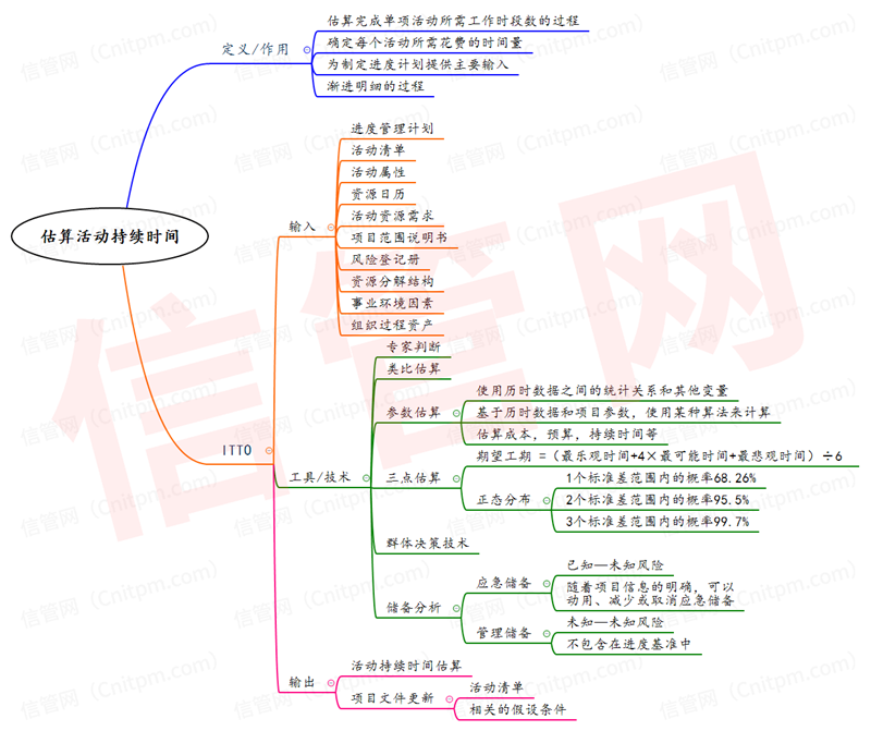 活动清单,活动属性,活动资源需求也都是该过程的输入;估算活动持续时间除了三点估算外,还可以用的工具与技术有参数估算,类比估算,专家判断,群体决策等;