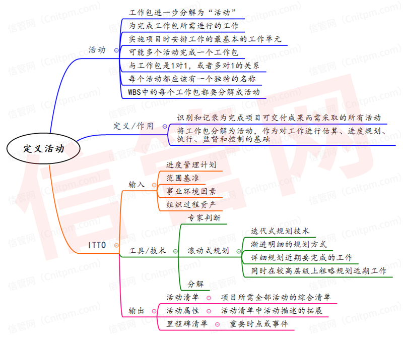活动概念:WBS中最底层的工作包,可以进一步细分为更小的组成部分,是实施项目时安排工作的最基本的工作单元。定义活动:识别和记录为完成项目可交付成果而采取的的所有活动。