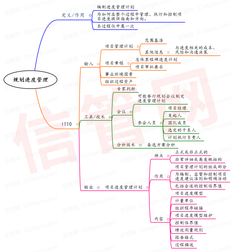 规划进度管理是进度计划的一个过程,它的输入是项目管理计划,项目章程,组织过程资产和事业环境因素,输出是进度管理计划,可以使用的工具与技术有分析技术,会议,专家判断三种。