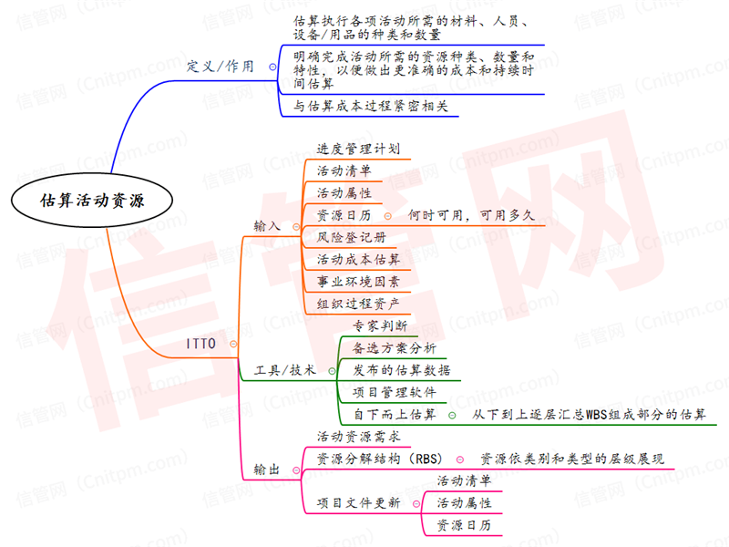 概念:估算执行各项活动所需的材料、人员、设备或用品的种类和数量的过程,明确完成活动所需的资源种类、数量和特性,以便做出更准确的成本和持续时间估算。
