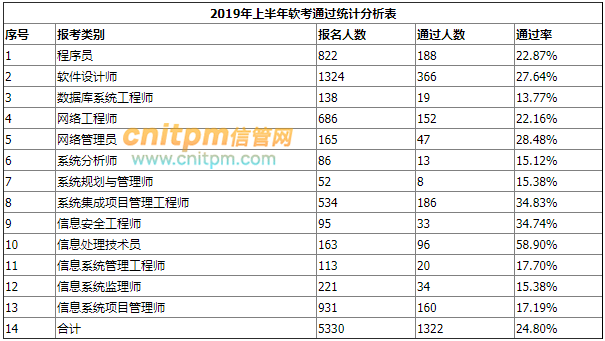 2019年上半年江苏软考办发布了计算机技术与软件考试软考全省合格率统计情况,其中江苏全省2019年上半年网络工程师报名人数为1149人,参考人数为779人,参考率为67.8%,合格率为32.73%,具体如下表: