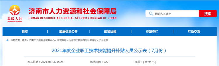 原文链接:济南市人力资源和社会保障局 公示公告 2021年度企业职工技术技能提升补贴人员公示表(7月份)