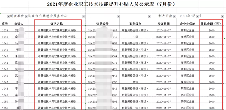 近日,四川和济南人社局公布了2021年最新一批技术技能提升补贴人员公示名单,其中,取得软考证书即可申领补贴,高级可得2000元,快来看看吧!