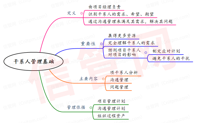 干系人管理基础主要分为定义(项目干系人管理主要由项目经理来做),内容(干系人分析,问题管理,沟通管理),重要性三部分;重要性具体来说有得到有影响力的干系人对项目的支持,获得更多的资源。