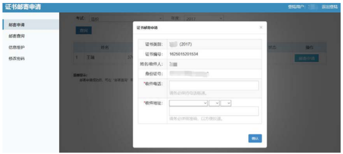 如果考生的证书允许申请,在“状态”列中会显示“可申请”。如果为其他情况,则有相应提示。在“可申请”情况下,点击“邮寄申请”按钮,将弹出操作对话框。具体界面如下: