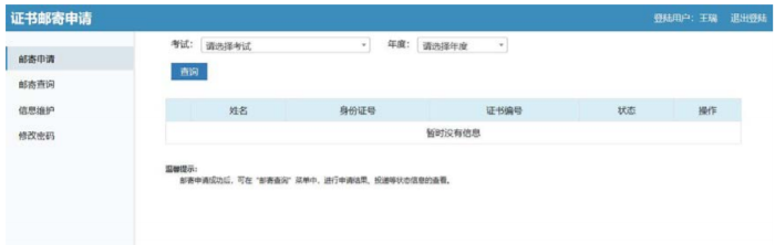 进行具体考试邮寄申请时,选择左侧菜单中的“邮寄申请”项。点击后操作界面如下图: