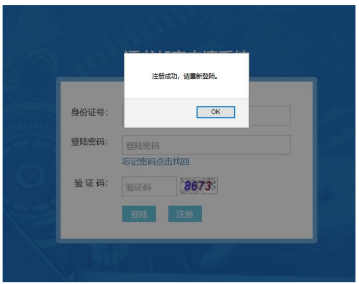 考生如实填写基本信息外,还需要上传身份证的正、反面图像。信息全部录入完成后,点击页面下方的“注册”按钮进行注册。如果成功,系统将会有相应的提示,如下图: