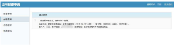 考生状态为“邮寄预申请成功”,说明考生邮寄申请已成功。后期,进行证书状态查询的话,点击“邮寄查询”按钮。点击后的操作界面如下: