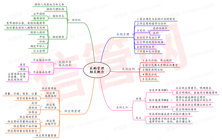 采购管理的相关概念包括招投标、采购步骤、采购不合格品控制、采购谈判、供应商管理、采购文件等。常考的内容是招投标和采购谈判。