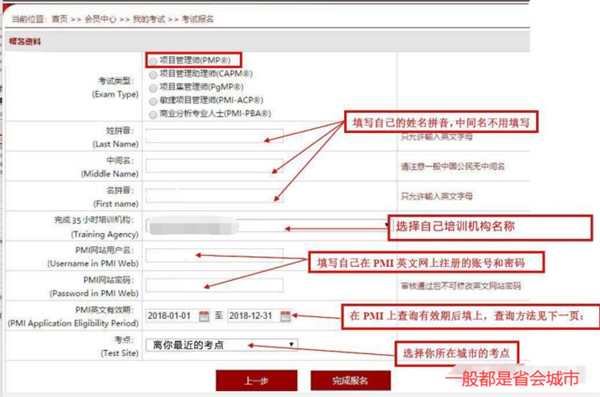 5、填写报名资料,需先登录PMI英文网站,查询PMI ID和有效期,或联系教务老师获取相关信息。