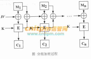 在下图给出的加密过程中Mi,i=1,2,…,n表示明文分组,Ci,i=1,2,…,n表示密文分组,IV表示初始序列,K表示密钥,E表示分组加密。该分组加密过程的工作模式是( )。