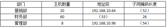 10、 某公司为多个部门划分了不同的局域网,每个局域网中的主机数量如下表所示,计划使用地址段192.168.10.0/24划分子网,以满足公司每个局域网的IP地址需求,请为各部门选择最经济的地址段或子网掩码长度。