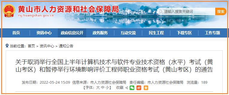 目前我市疫情防控形势复杂严峻,正处于疫情防控关键时期,考点学校基本处于封闭管控状态,各地对人员流动、聚集严格管控,不具备正常开考条件。根据近期疫情防控有关要求,为最大限度减少人员流动聚集,保障广大报考人员健康安全,确保疫情风险可防可控,经研究,决定取消举行黄山考区上半年计算机技术与软件专业技术资格(水平)考试(原定5月28日、29日举行)和暂停举行黄山考区环境影响评价工程师职业资格考试(原定5月28日、29日举行)。