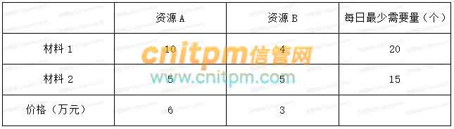 一个顶日需要A和B两种资源,每种资源包含材料1、材料2。对于项目来说,这两种材料每日需要量如表所示。请问项目每日使用资源A的量为(),使用资源B的量为(),可使得在满足要求的情况下总费用最少。