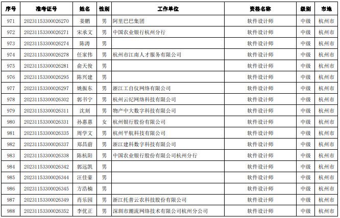 浙江2023年上半年软件设计师合格人员名单已经公布,根据浙江人社局发布的《浙江省人力资源和社会保障厅关于公布2023年监理工程师、环境影响评价工程师、上半年计算机技术与软件专业技术资格考试合格人员名单的通知》可以得知,浙江2023年上半年软件设计师合格人员共731人。