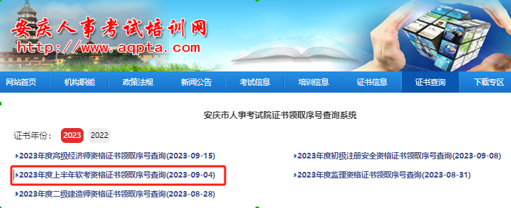 根据安庆人事考试网《安庆市人事考试院证书领取序号查询系统》可以得知,安庆2023年上半年软考证书已于2023年9月4日起开始发放,证书领取序号查询系统查询入口已经开通。