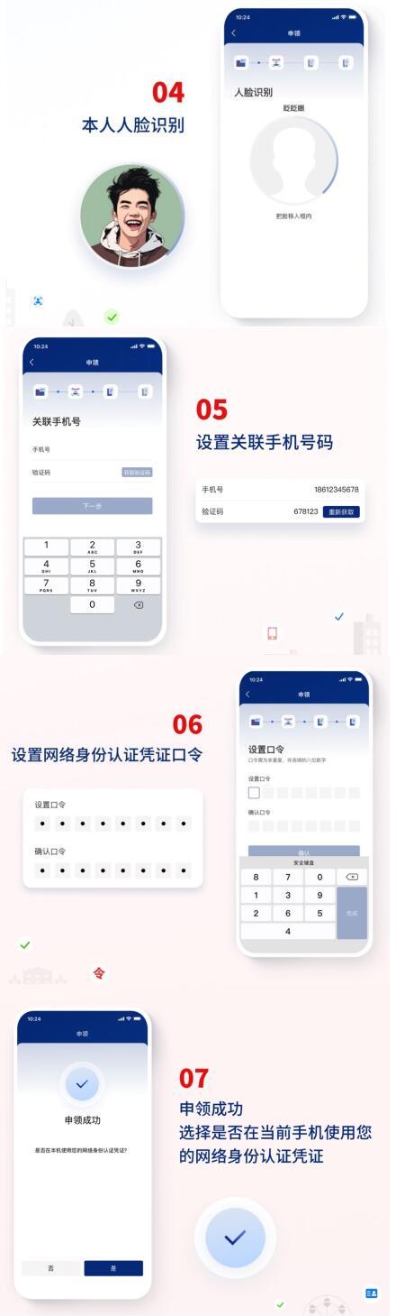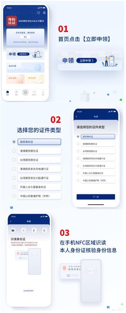 方式二:可到政务大厅、电信营业厅等可信场所使用自助开通设备申领网络身份认证凭证后,将该网络身份认证凭证授权在自己手机上进行使用。
