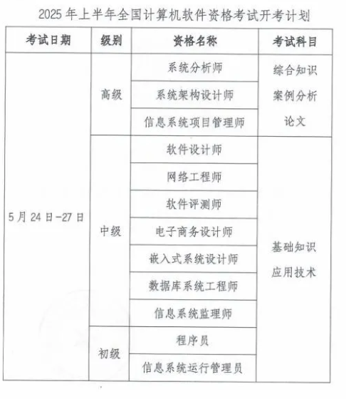 2025年全国计算机软件资格考试采取计算机化考试(机考)方式,开考资格、考试科目详见《2025年上半年全国计算机软件资格考试开考计划》(附件1)。