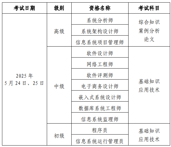 2025 年上半年计算机软件资格考试设置初、中、高三个级别,各级别资格名称及考试科目见下表: