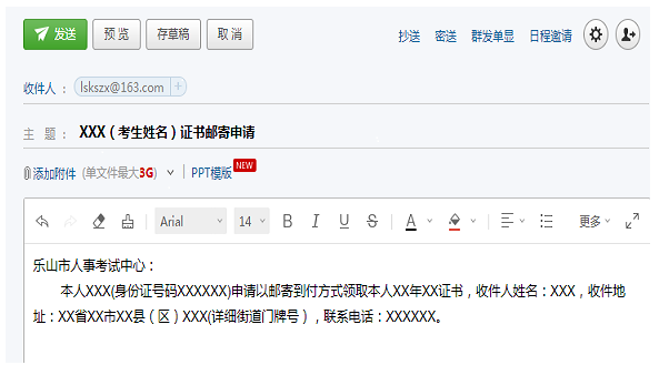 如需邮寄领取,请将本人手持身份证照片及领证申请发送至乐山市人事考试中心电子邮箱,并来电告知申请办理。