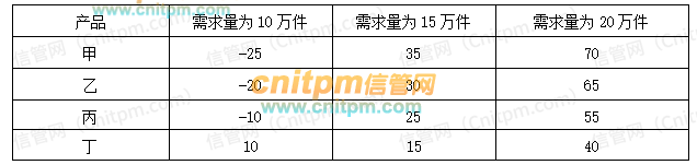 某公司主营产品有甲、乙、丙、丁四种。按照历史数据预测,下半年的市场需求总量可能有 10 万件、15 万件和 20 万件三种情况,对应的概率分别为 50%、30%、20% 不同情况下各产品带来的市场收益(单位:万元)如表所示。为了追求利润最大化,该公司应该生产()