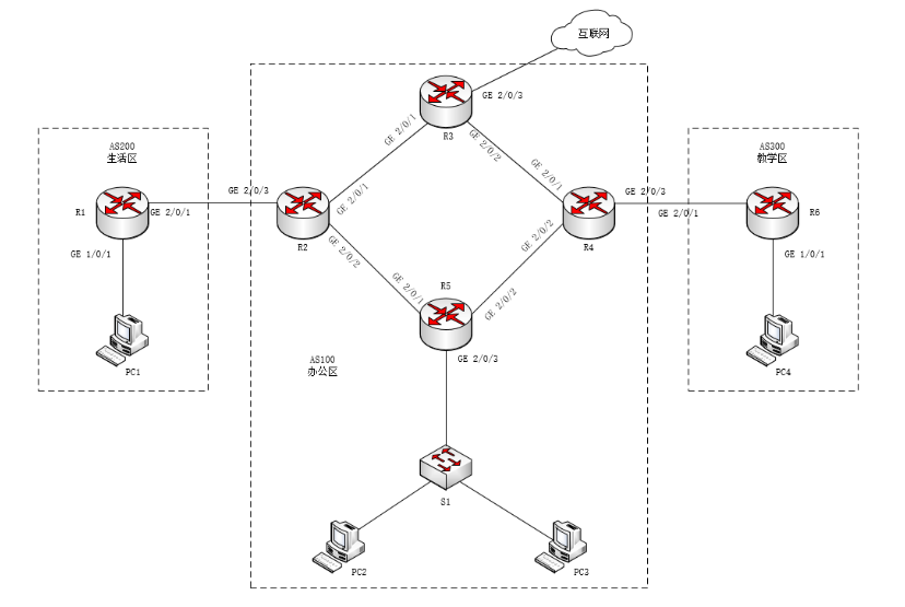 图3-1为某大学的校园网络拓扑,由于生活区和教学区距离较远,R1和R6分别作为生活区和教学区的出口设备,办公区内部使用OSPF作为内部路由协议。通过部署BGP获得所需路由,使生活区和教学区可以互通。通过配置路由策略,将R2-R3-R4链路作为主链路,负责转发R1和R6之间的流量;当主链路断开时,自动切换到R2-R5-R4这条路径进行通信。
