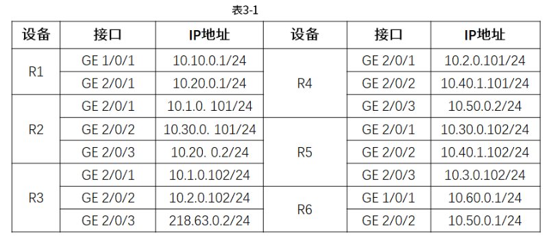 办公区自制系统编号100、生活区自制系统编号200、教学区自制系统编号300。路由器接口地址信息如表3-1所示。