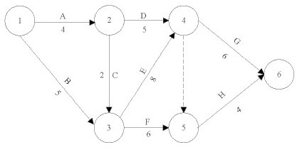某工程的双代号网络计划如下图所示,则其关键路径时间为 (1) 天,作业F的自由时差为 (2) 天,节点5的最迟完成时间为 (3) 天。