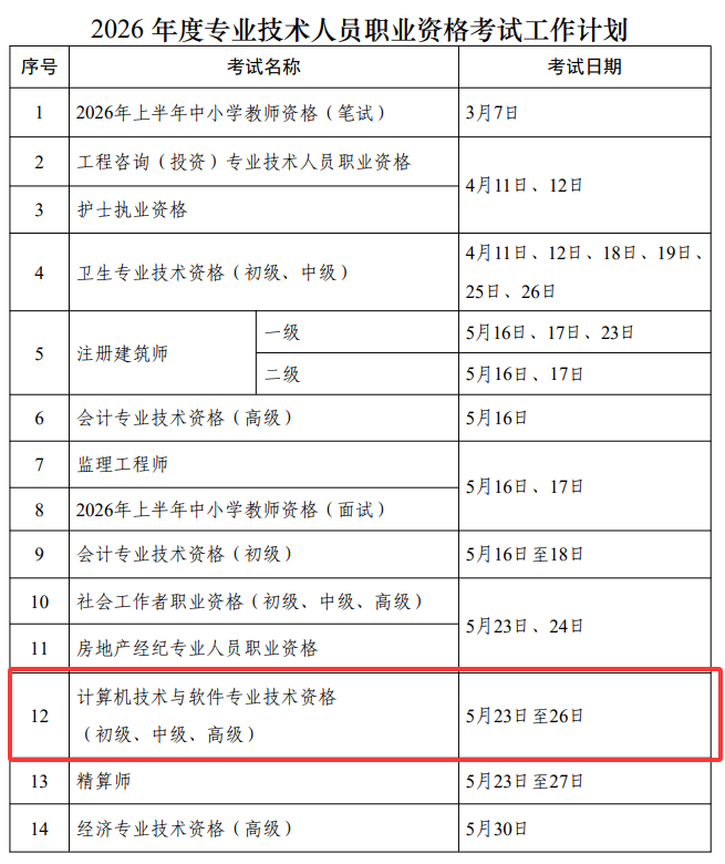 2026年软考考试时间:上半年考试时间为2026年5月23日-26日;下半年考试时间预计为2026年10月24日-27日