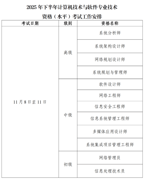 有关各个资格科目的开考时间可以关注软考办发布的《2026年度计算机技术与软件专业技术资格(水平)考试工作计划》 ,请考生一切以官方通知为准。发布时间预计在2026年2月份。