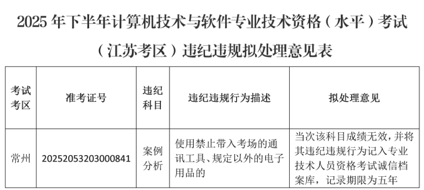 2025年下半年计算机技术与软件专业技术资格 (水平)考试(江苏考区)违纪违规拟处理公告