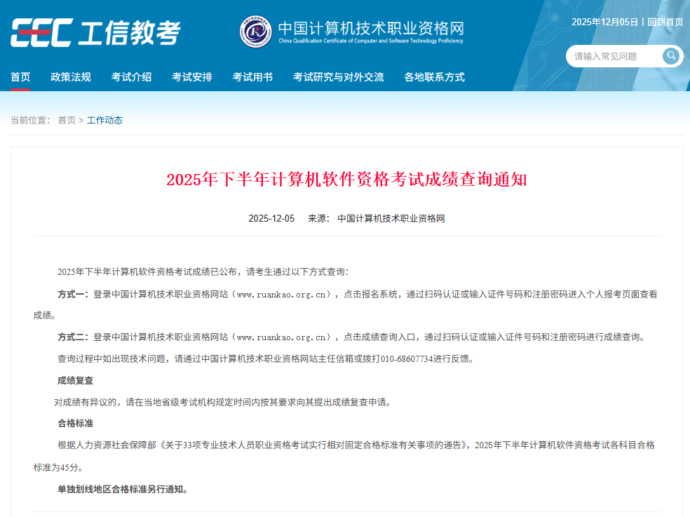 2025年下半年计算机软件资格考试成绩已公布,请考生通过以下方式查询: