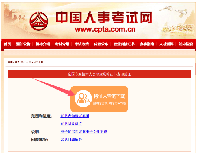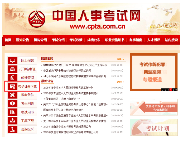 第一、进入中国人事考试网 http://www.cpta.com.cn/ ,找到左侧的 "电子证书下载" 栏目,直接点击即可。