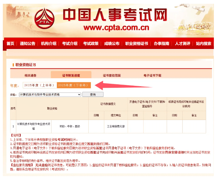 考生打开中国人事考试网→点击“证书查询验证”→点击“证书制发进度”→点击“2025年度(下半年)”→找到“计算机技术与软件专业技术资格”就可以查看2025下半年证书办理进度。