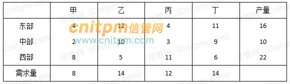 某公司有东部、中部、西部三个生产基地,生产的产品需要运送带甲、乙、丙、丁四个市场,从生产基地到各个市场的单位运价及产量和需求量如表所示,完成该运输任务所需的最小运费为( )。