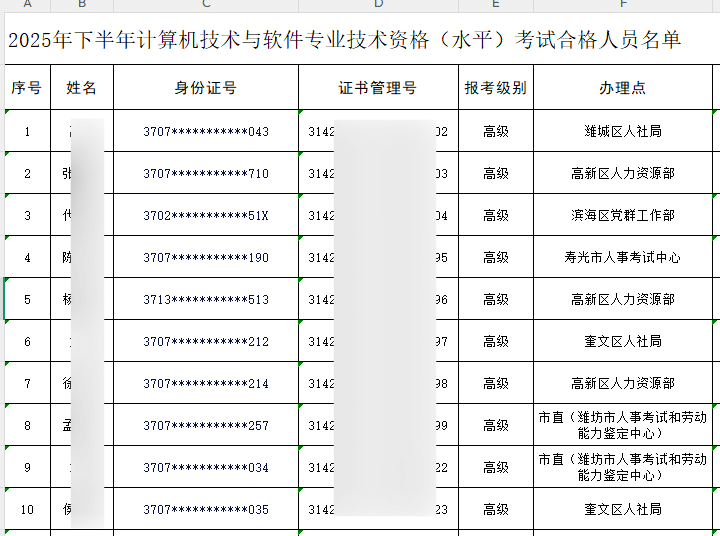 根据潍坊人社局发布的《关于办理2025年下半年计算机技术与软件专业技术资格(水平)证书的通知》得知,山东潍坊2025年下半年软考合格人员共计189人,其中高级资格30人,中级资格118人,初级资格41人,具体名单如下。