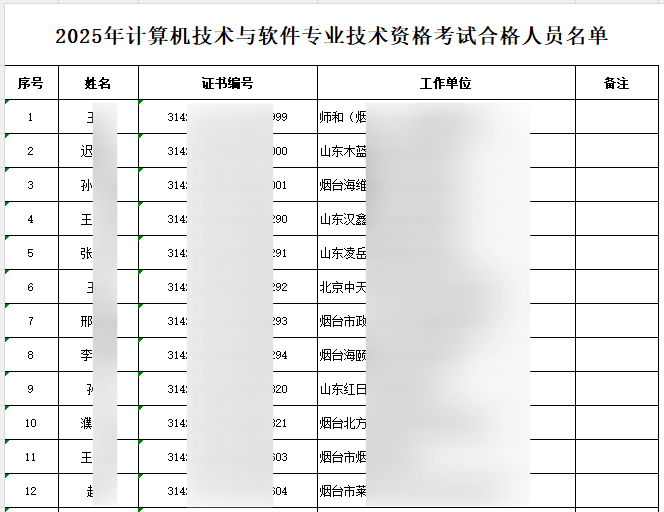 根据烟台人社局发布的《关于办理2025年下半年计算机技术与软件专业技术资格证书的通知》得知,山东烟台2025年下半年软考合格人员共计179人,具体名单如下: