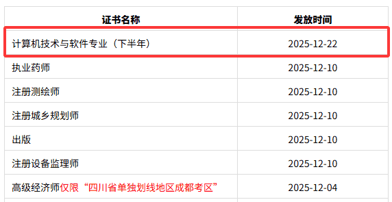 根据成都人社局官网了解得知,四川成都2025年下半年软考证书于2025年12月22日开始发放,考生可通过快递邮寄和现场办理两种方式领取,具体领证相关事宜如下: