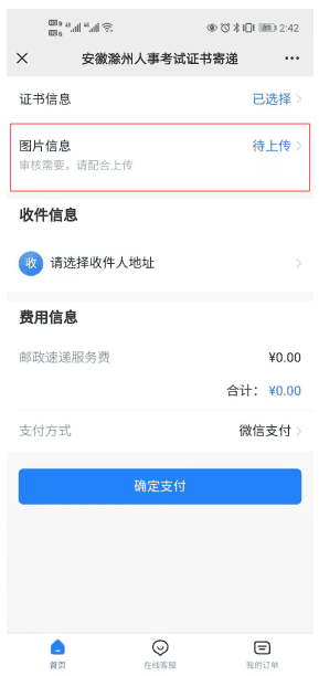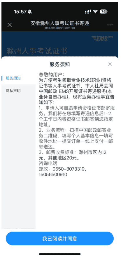 2、邮寄服务办理流程:扫描中国邮政邮寄业务二维码—填写考生信息—核对考生证书信息—上传考生本人手持身份证照片—填写收件地址—系统自动计费—线上支付—邮寄送达。