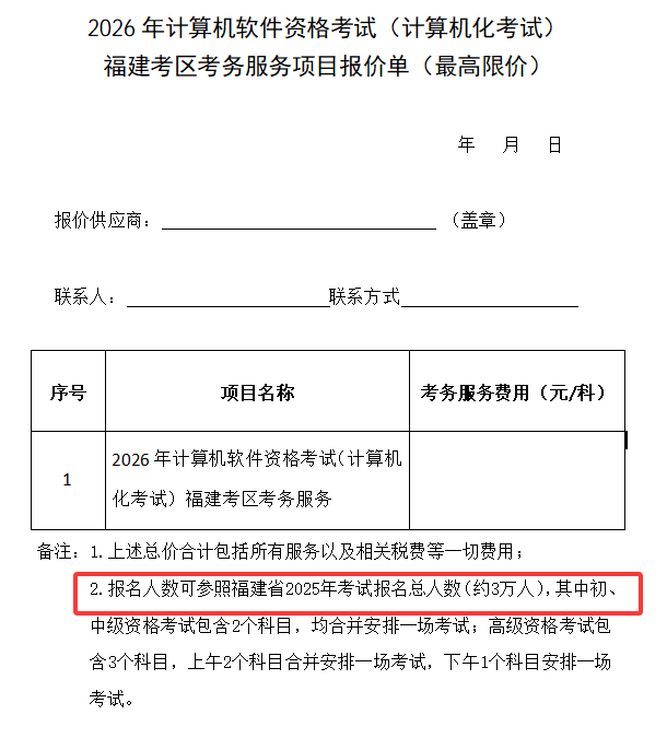 根据福建工信厅发布的《关于2026年计算机软件资格考试(计算机化考试)福建考区考务服务项目采购预公告》得知,福建2025年软考报名人数约3万人左右。