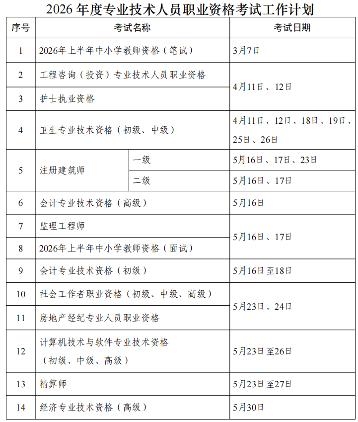 根据人社局官网发布的《人力资源社会保障部办公厅关于2026年度专业技术人员职业资格考试工作计划及有关事项的通知》可以得知:2026年上半年软考考试时间为2026年5月23日至26日。